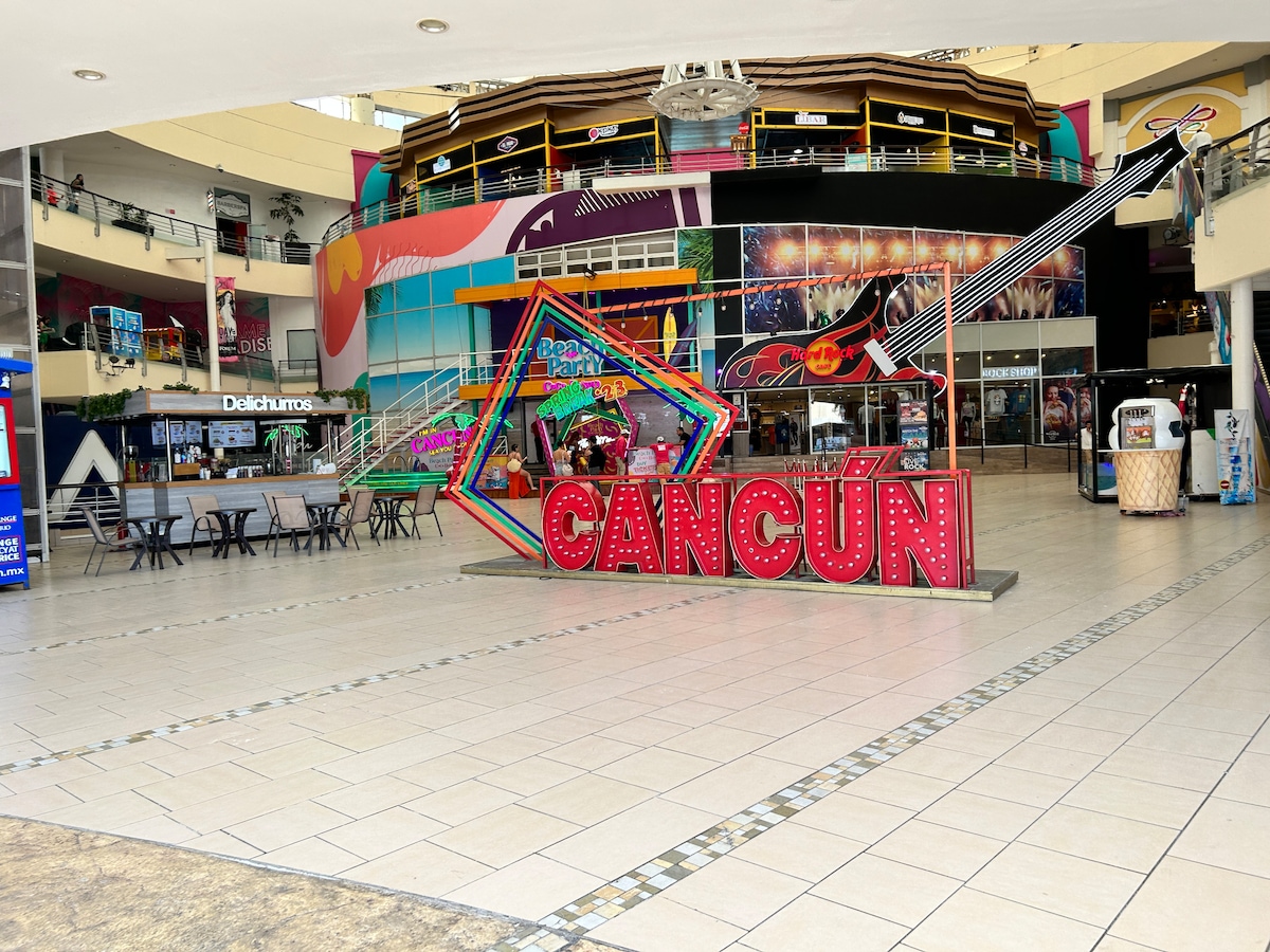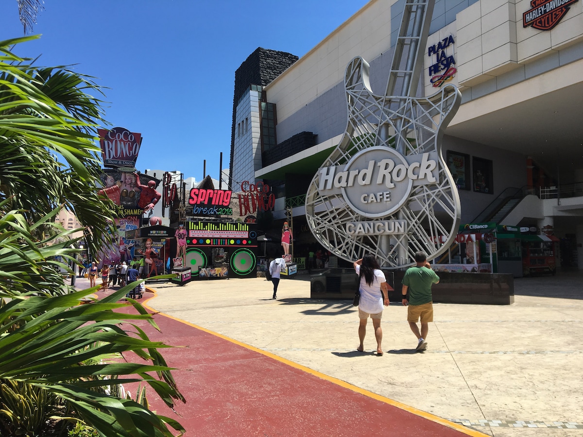 Walk 1/2 block to The Forum, on your right, where you will find 30 stores and restaurants including Sr. Frogs, Coco Bongo, Fat Tuesday', Souvenir Shops, an AMAZING Food Court Upstairs.