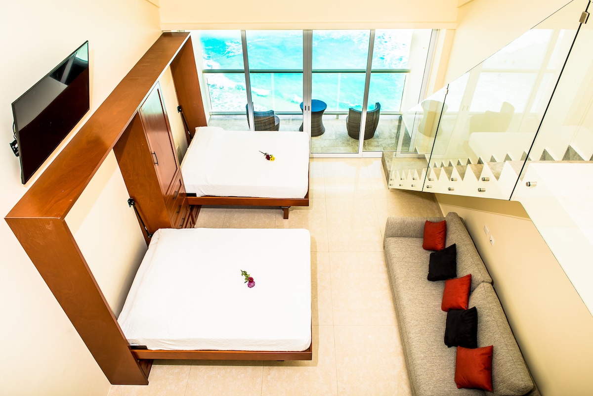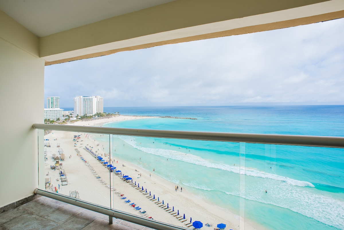 Walk out of the lobby and right onto the white sandy beach and jump into the enchanting water! Eat, drink, play and shop 1/2 block away at many restaurants and bars including Sr. Frogs, Coco Bongo, Mandala Beach Club and The Forum Shopping Center! Located right in the middle of all the action!
